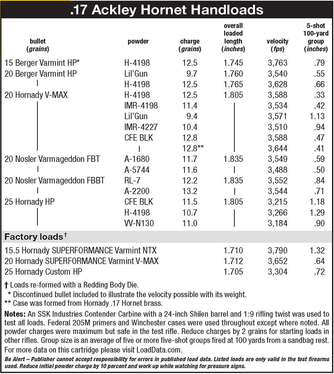 One wonders if bullet weight in the Ackley data might have been a typo. Hodgdon’s 2018 Annual Manual shows a maximum velocity of 3,242 fps for a 25-grain bullet at a chamber pressure of 45,000 psi. Hodgdon did reach and even exceed 3,500 fps, but with a 20-grain bullet. So how fast is the 17 Ackley Hornet and how does its velocity compare with its bigger cousins? Velocity will vary from rifle to rifle, but from the 24-inch barrel of the SSK Industries custom Contender I am presently shooting, maximum velocities for 20- and 25-grain bullets are in the neighborhood of 3,575 fps and 3,250 fps, respectively. Higher velocities are possible, but case life is shortened.