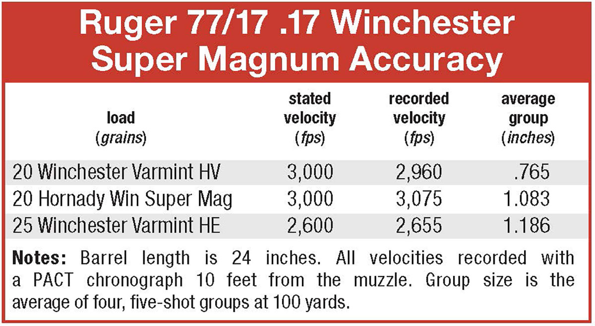 All loads were checked for velocity using a PACT chronograph set 10 feet from the Ruger’s muzzle. The 25-grain Winchester loads gave an average velocity of 2,655 fps; the 20-grain Winchester load averaged 2,960 fps; and the Hornady branded 20-grain ammunition averaged 3,075 fps. For comparison, when checking velocities from the muzzle with the 22-inch barreled B-Mag more than a year ago, the Winchester 20-grain load averaged 2,987 fps, and velocity was 2,584 fps with the 25-grain load. Those velocities were recorded at 6 feet. Any variance in results from the two rifles should be taken with a grain of salt for several reasons, including that when chronographing with the Ruger 77/17, sun angle required setting the chronograph farther away from the muzzle. Secondly, different rifles, even of the same make and/or with the same barrel length, are likely to give different velocities anyway.