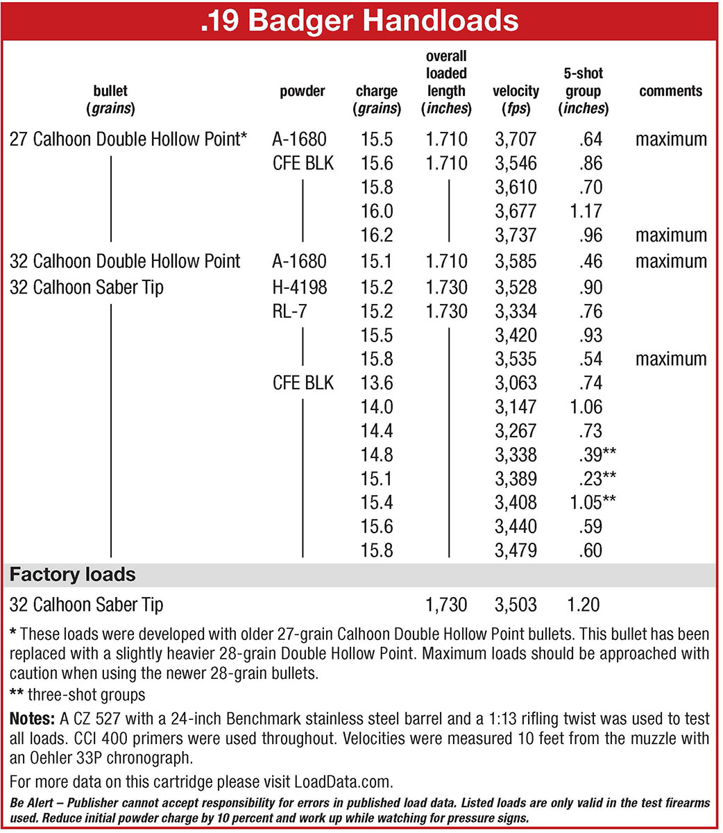 While I do not do as much volume shooting as I once did, the old 19 Calhoon Hornet became a staple in my varmint hunting battery. After shooting the 19 Badger, I wished it was around back when I bought the 19 Hornet conversion kit in 2000 to turn my Ruger 77/22 Hornet into the 19 Calhoon Hornet. Leahy said the Rugers did not convert well to the 19 Badger because the lock-up just was not as strong or rigid as the CZ mini-Mauser action. But then I’ve always wanted one of the little CZ 527s, and the 19 Badger would not be a bad choice. Visit jamescalhoon.com or call (406) 395-4079.