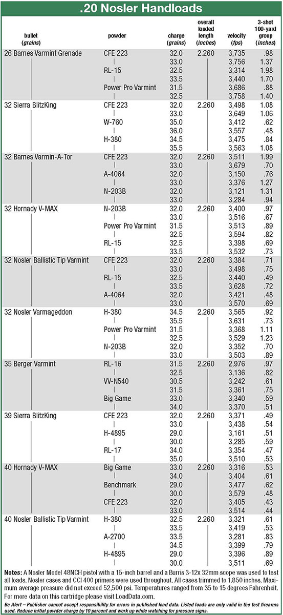 Discussions with Zach Waterman, Nosler’s director of public relations, led to my receiving a Nosler Model 48 Nosler Custom Handgun (NCH) chambered for the new 20 Nosler cartridge.
