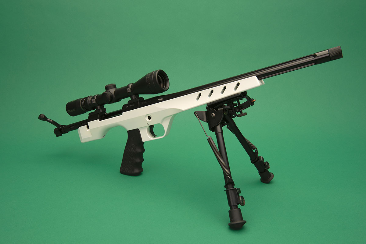 The pistol has no sights. A long eye-relief scope is anticipated, and the receiver is contoured to accept Remington Model 700 scope bases. The test sample came equipped with a Burris 3-12x 32mm handgun scope mounted with Leupold rings and bases. Weight without sights or accessories is about 6.5 pounds; with scope and bipod it tips the scales at about 8 pounds.