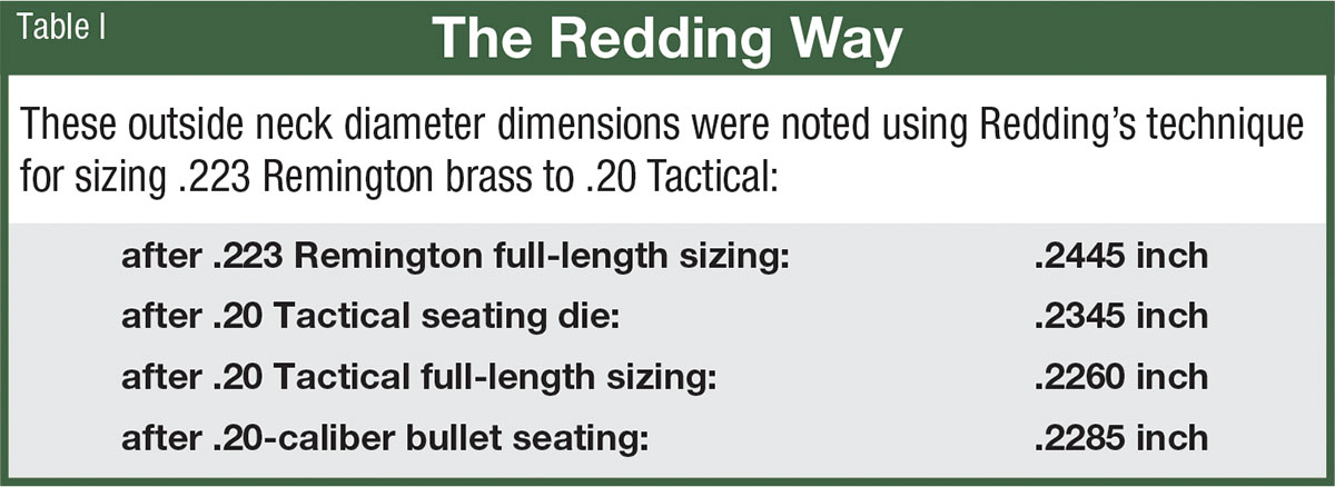 I needed reloading dies and turned to Robin Sharpless of Redding Reloading to discuss the project. Redding had 20 Tactical dies in stock along with a form-and-trim die for making cases from 223 Remington brass. Robin sent the form-and-trim die along as well but said I probably wouldn’t need it. Redding had developed, he said, a technique for forming 20 Tactical from 223 Remington brass without it. First the cases are sized in a full-length 223 die, then run, slightly lubricated, into the 20 Tactical seating die. This reduces the neck diameter slightly. Finally, the case is run into the full-length 20 Tactical sizing die that sets the shoulder back and makes the cases ready for fireforming. No trimming is necessary if the cases were the proper length before starting. Nor is there a need for neck turning. (The dimensions through transition are listed in Table I.)