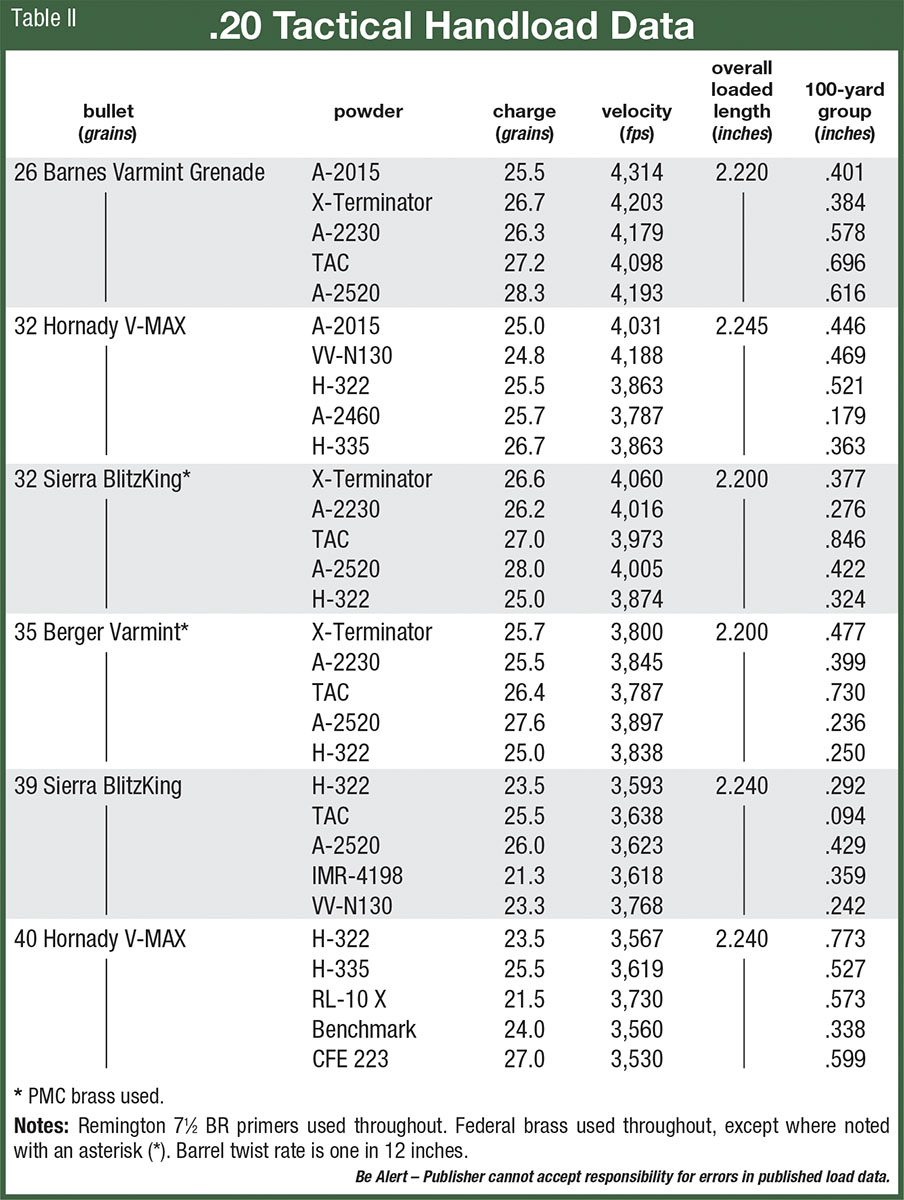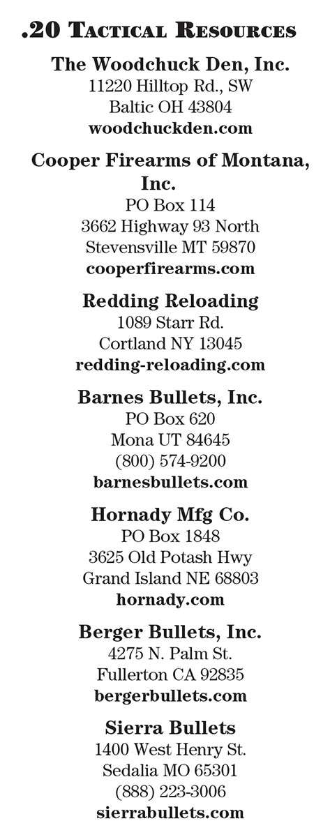 The project has been great fun, and I’ve never shot as many three-shot groups with all bullets making a single hole as was experienced with the 20 Tactical. Most of the credit must go to the fine Cooper rifle and good bullets, but the cartridge design is certainly entitled to its share.