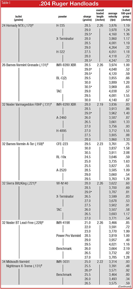Nosler’s Ballistic Tip Lead-Free produced a sub-half-inch group with 29 grains of Alliant Power Pro Varmint, that .40-inch group the best with this bullet. Vihtavuori N-140 provided .60- to .81-inch groups with Sierra’s BlitzKing and likely deserves more exploration. Only Power Pro Varmint (29.5 grains) broke the heralded 4,000-fps mark with 32-grain bullets from the short 20-inch barrel. (The 204 Ruger generally sacrifices 40 to 50 fps for each inch of barrel subtracted from 24 inches). Also of note, IMR-4198 (listed as Nosler’s most accurate powder) failed to cycle the AR action, though accuracy was good.