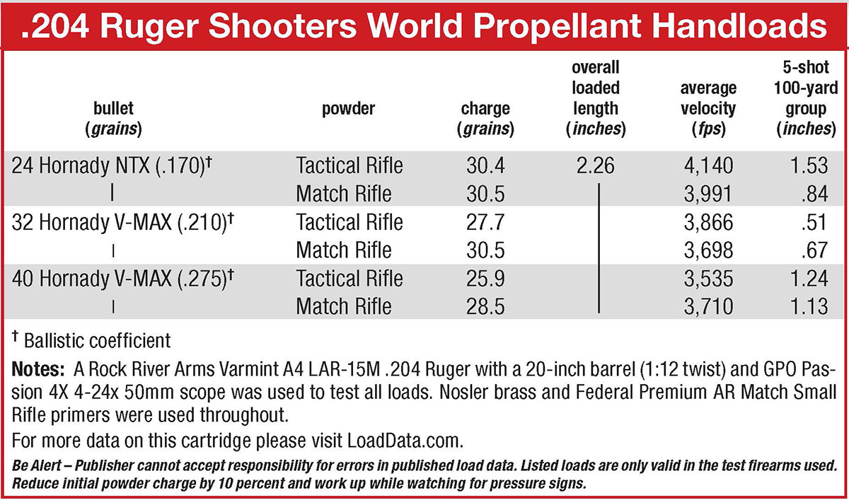 Shooters World offers 15 powders to cover pistol and rifle handloading needs, from the smallest to largest cartridges. Of those, Tactical Rifle and Match Rifle are best suited to the 204 Ruger. These are double-base, spherical powders that flow like water.