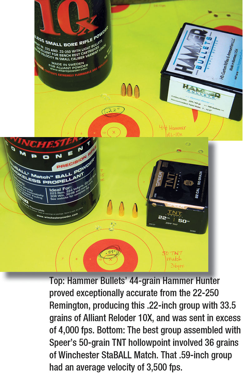 Bullets for this project were chosen to represent a wide spectrum of styles and updated designs were selected when available. This included a lead-free, monolithic copper bullet I hoped would prove compatible with the Winchester’s 1:14 twist rate. The Hammer Bullets 44-grain Hammer Hunter hollowpoint comes with a 1:14 to 1:12.5 minimum twist recommendation and included a .192 G1 BC. It was paired with Vihtavuori N150, Alliant Reloder 10X and Winchester StaBALL Match. This bullet proved particularly accurate with all assembled groups averaging .71 inch, which was heavily skewed by Winchester StaBALL Match’s 1-inch-plus groups. In fact, StaBALL Match proved a poor choice for this bullet. Vihtavuori N150 provided consistent accuracy with all loads, but failed to break the 4,000-fps mark like the other two powders. Still, .27- and .41-inch groups at 3,489 and 3,610 fps are nothing to get snooty about. Alliant Reloder 10X tied for the smallest group using 33.5 grains of powder and pushing things along in excess of 4,000 fps (my LabRadar only records velocities to 3,999 fps). That group measured .22 inch.