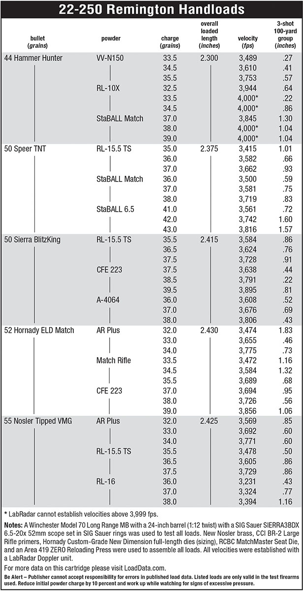 I certainly learned a lot during this project, discovering some new powder options for the old favorite varmint cartridge, as well as some bullets I am now anxious to test in my own 22-250 Remington. Those Hammer Hunter bullets printed one-hole groups at 4,000-plus fps are at the top of that list! I also confirmed Hodgdon’s CFE 223 still has it, in both the accuracy and velocity departments. Vihtavuori N150, Reloder 10X, and Accurate 4064 will certainly become part of my regular repertoire, while Winchester StaBALL Match, Reloder 15.5 TS, and Shooters World AR Plus obviously deserve further experimentation.