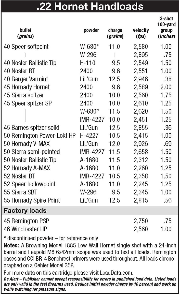 Today, with modern components that deliver minute-of-angle accuracy, and a fine rifle like the Browning 1885 Low Wall, the 22 Hornet is still a great cartridge for taking woodchucks in the north forty. With its mild report and economical handloads, the 22 Hornet will be around for a long, long time.