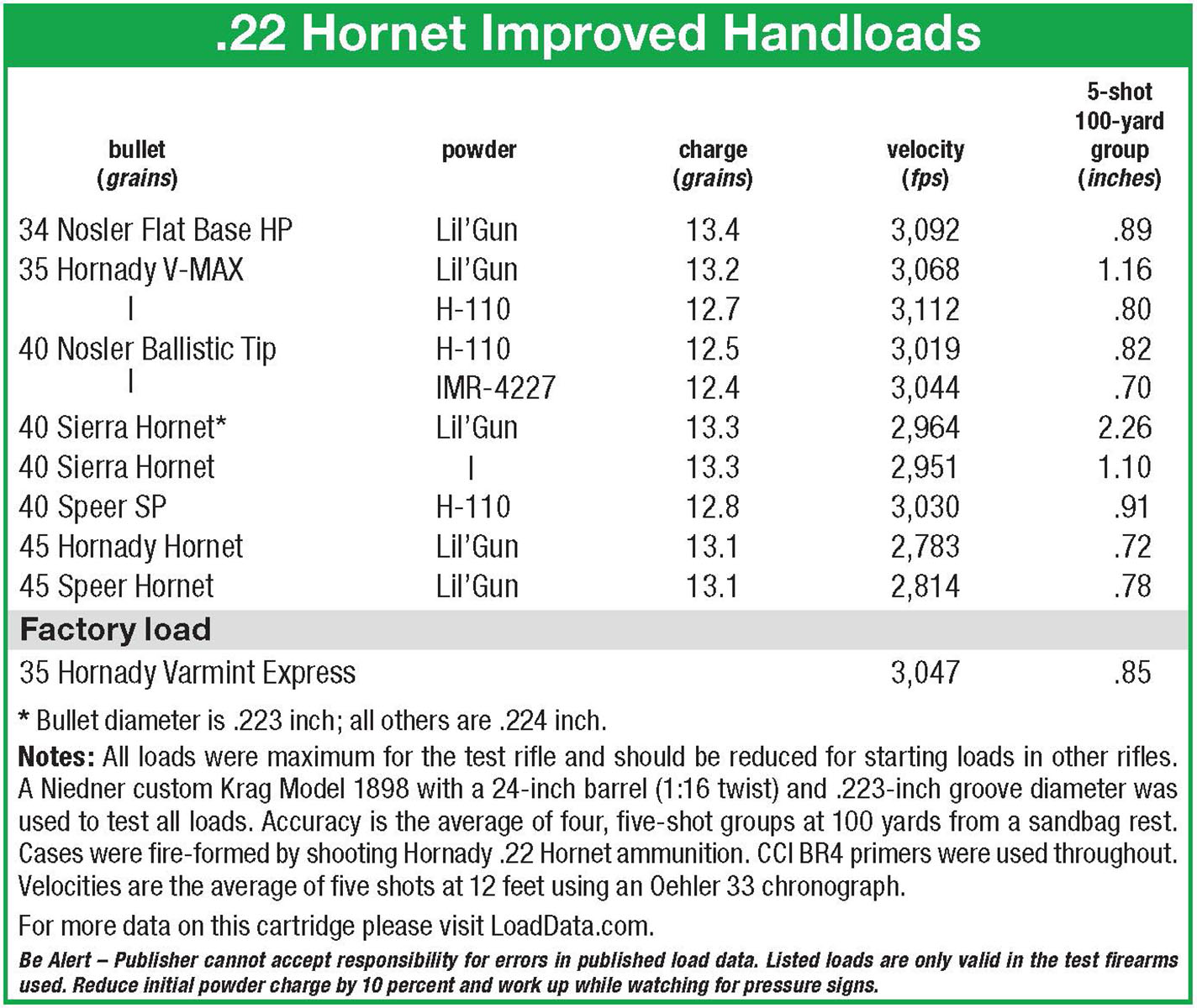 Why there is no caliber marking on the barrel of my rifle remains a mystery. The previous owner believed it was built during the 1920s when various gunsmiths were chambering rifles for the 22-13-45 Winchester (22 WCF) case loaded with smokeless powder and jacketed bullets. Niedner formed 40-grain bullets from spent 22 Long Rifle cases while others loaded 45-grain bullets made by Remington for the 5.5mm Velo Dog handgun cartridge.