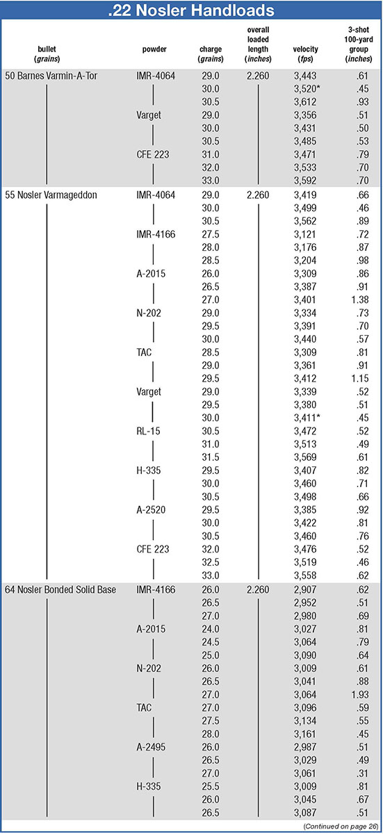 Fifty-five-grain bullets are probably the best weight for varmint loads with higher ballistic coefficients (BCs) that help to keep velocity up and minimize wind drift. Nosler’s 55-grain Varmageddon is a flatbase, polymer-tipped bullet designed for varmint hunting. An overall length of .795 inch aids in producing a BC of .255. Having said that, Nosler has introduced a 53-grain flatbase, polymer-tipped bullet in the Varmageddon series with an overall length of .830 inch and a BC of .303. (Unfortunately, I did not get to try these.) Sub .5-inch groups with the 55-grain bullets were obtained with IMR-4064, Varget, RL-15 and CFE 223.