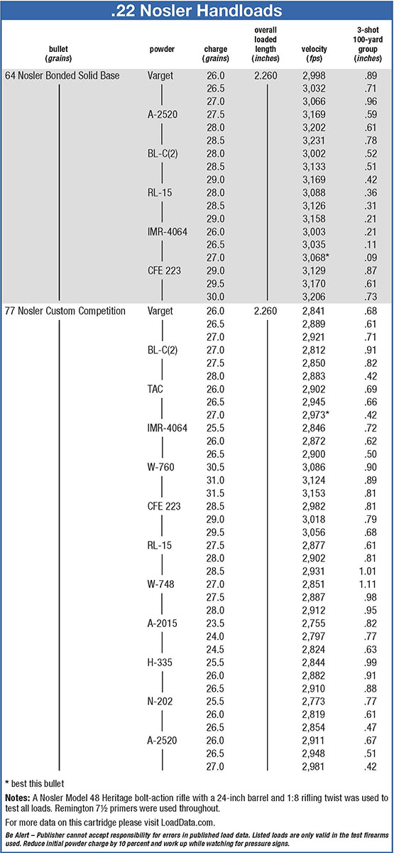 Now to the good part: handloading and shooting. I went through the barrel break-in regimen using factory ammunition. After that I chronographed the Nosler 55- and 77-grain factory loads. According to Nosler data, with a 24-inch barrel the 55-grain load averages 3,500 fps. My chronograph showed 3,652 10 feet from the muzzle. My first reaction was that Nosler had loaded the factory ammunition a bit on the warm side. Actually, throughout the testing, Nosler’s velocity projections for a given powder charge were frequently exceeded.
