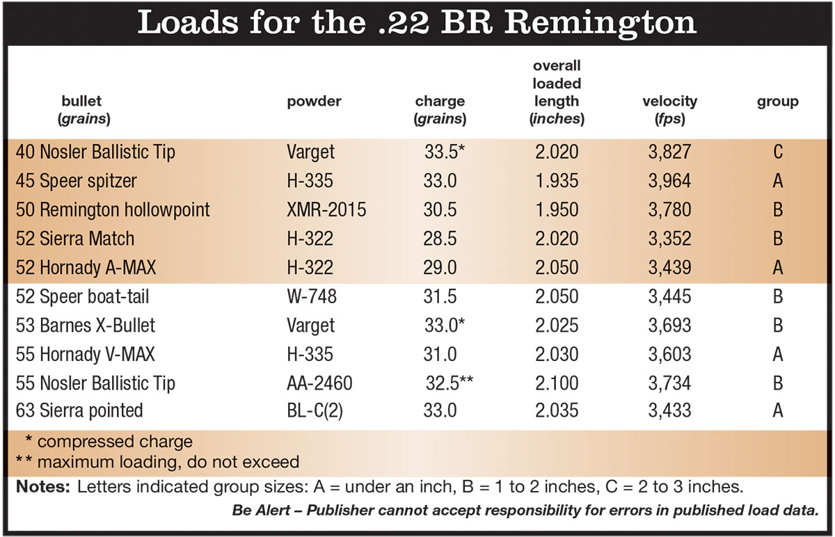 Before all that, however, let’s compare the .22 BR with a few close wildcat relatives. With safe reloading practices, you can, with off-the-shelf 50-grain, .224-inch bullets, raise the .22 BR to around 3,700 fps. The .22 PPC can churn up about 3,418, while the .22 CHeetah (which might not be a fair comparison as it exceeds the famed .220 Swift by about 10 percent) will hit close to 3,900 fps depending on barrel length and outside temperature. Still, to get a closer prospective using readily available commercial ammunition and still loading that 50-grain bullet, the .222 Remington can edge up to 3,140 fps, the .223 Remington, around 3,240 fps and one of my favorites, the .224 Weatherby, about 3,700 fps with 24-inch barrels.