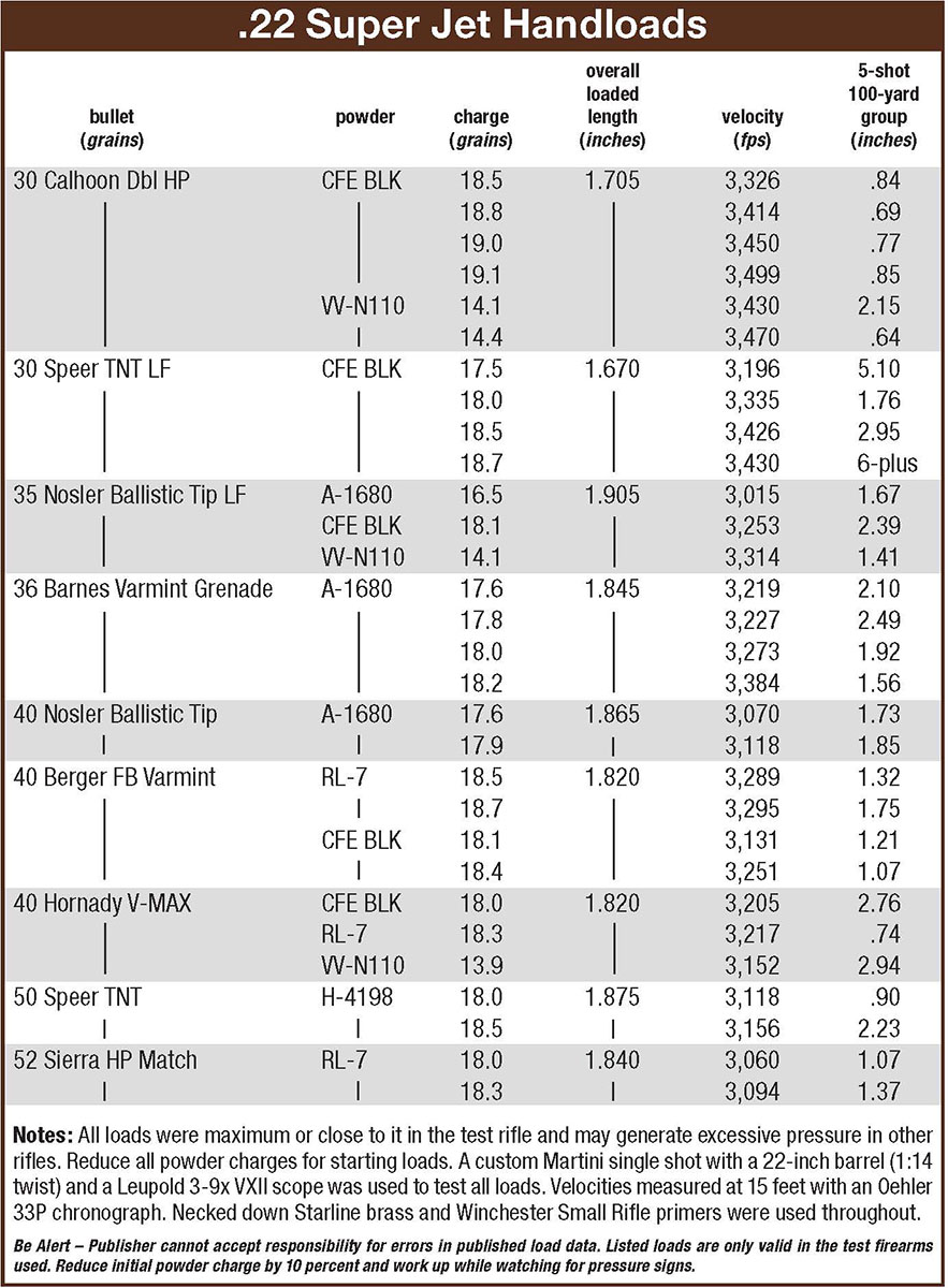 I was anxious to try CFE BLK in the Super Jet. This powder has become a go-to powder in my 19 Calhoon Hornet because of its reported clean-burning qualities and consistency. Also included were Vihtavuori N110, Accurate 1680, Reloder 7 and H-4198. I stuck with bullets on the light end of the .22-caliber spectrum, not going above the 52-grain Sierra hollowpoint match bullet because the rifle barrel had a 1:14 twist rate. The other lead-based bullets tested included the Speer 50-grain TNT hollowpoint, the Hornady 40-grain V-MAX, the Berger 40-grain FB Varmint, Nosler 40-grain Ballistic Tip and the Calhoon 30-grain Double HollowPoint. Three non-lead bullets included the Speer 30-grain TNT, Nosler 35-grain Ballistic Tip and the Barnes 36-grain Varmint Grenade.