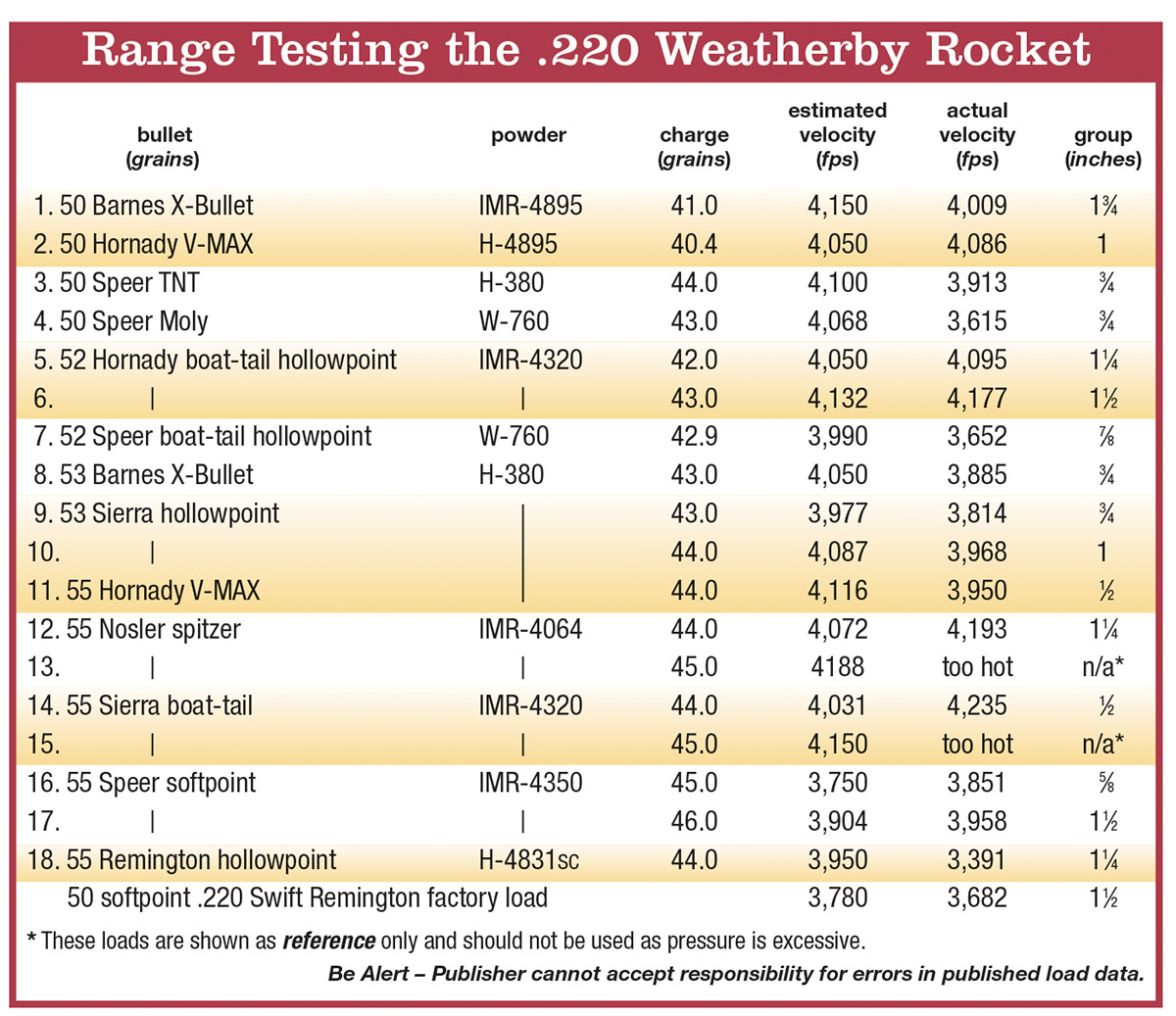 Finding data on the Rocket is difficult, especially since it’s long past being front-page news. A call to Weatherby produced one page of data from a vintage copy of Tomorrow’s Rifles Today, a promotional booklet published by Weatherby in years past. A much faster way to find important information is to get a copy of Wayne Blackwell’s “Load From A Disc” ballistic program. After loading the CD in your computer, a full set of options appears. To start, click on “Internal,” select a rifle cartridge (standard, wildcat and custom are included), then hit .220 Weatherby Rocket. Case capacity in grains of water, overall cartridge length (with bullet) and a drawing of the case appear on the screen.