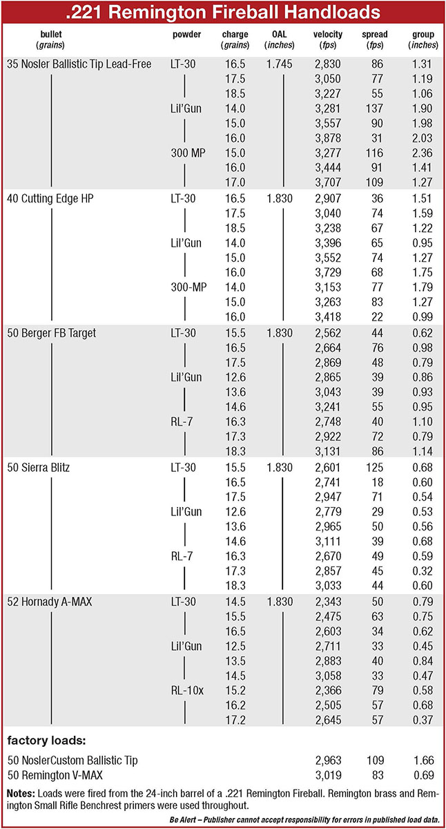 The 221 Remington Fireball’s small case capacity, roughly 21 grains of water, places limits on the powders used to those toward the faster end of the burning rate chart, and it also limited the spread between starting and maximum loads in the test to two grains. In most cases it was possible to end up with test data in one grain increments.