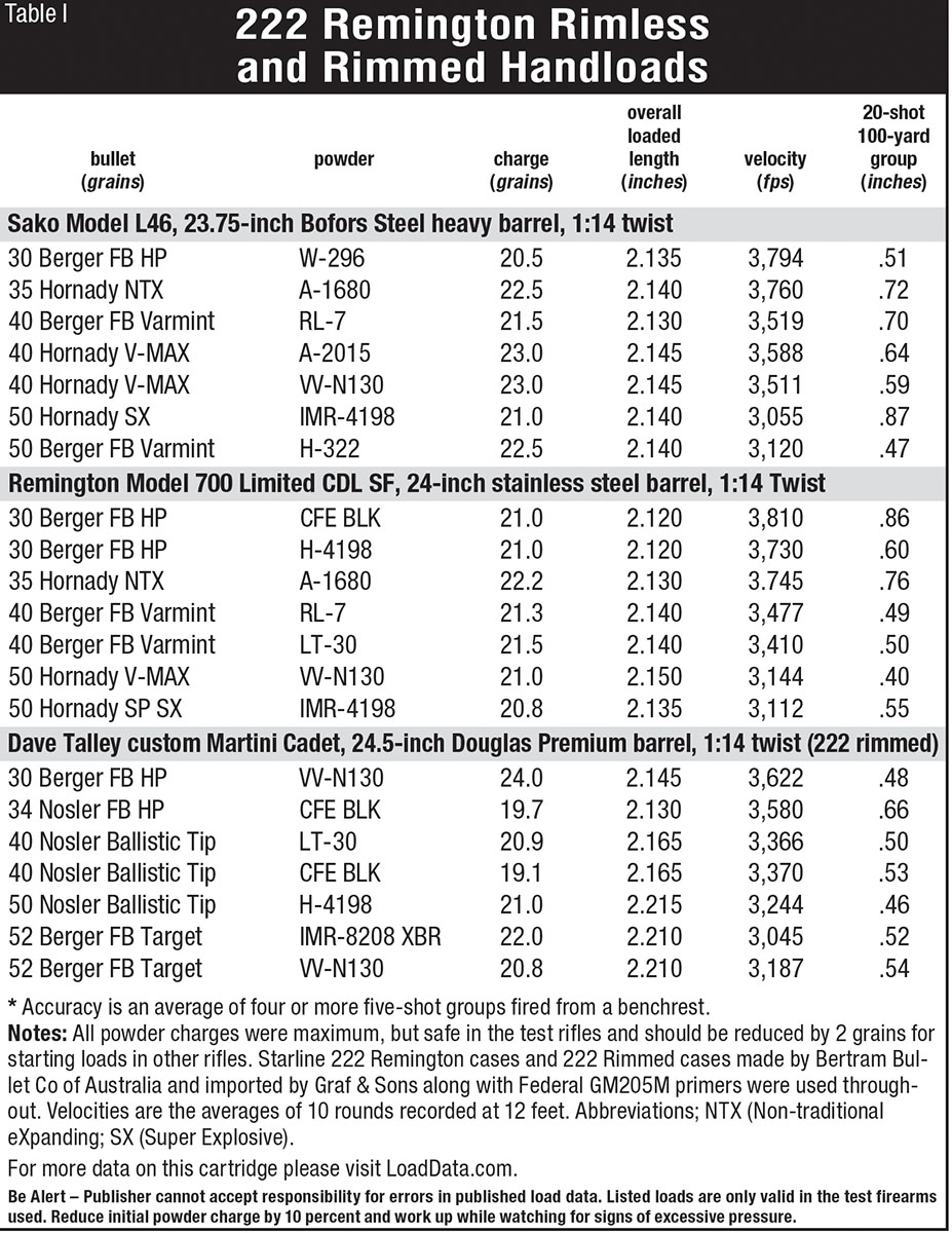 I doubt if many of today’s shooters are aware of the existence of a rimmed version of the 222 Remington. It was developed during the 1950s by the Super Cartridge Company of Australia for use in the small Martini Cadet action and it was often called the 222 Super. Giving the 222 Remington case a rim of the same diameter as the 38 Special made it compatible with the extractor of the Martini action. Those cases are presently made by Bertram Bullet Co. Pty Ltd of Victoria, Australia, and are imported by Graf and Sons of Mexico, Missouri (Grafs.com 573-581-2266). Due to a slightly thicker body wall, the 222 rimmed case is a bit stronger than the 222 Remington case, and gross water capacity is about a grain less.