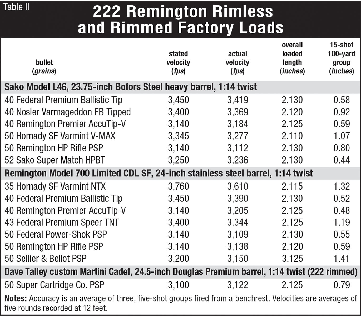The 222 Remington has always been a great candidate for handloading. During its 35-year reign over benchrest competition, IMR-4198 was the most popular powder used with Bruce Hodgdon’s military-surplus BL-C in a distant second place. Its eventual replacement, BL-C(2), never became as popular. H-322 and Reloder 7 have long been excellent choices and as newer propellants go, Reloder 10X, Vihtavuori N130 and Ramshot X-Terminator are worthy of a try. I have long favored the Remington 7½ Bench Rest primer.