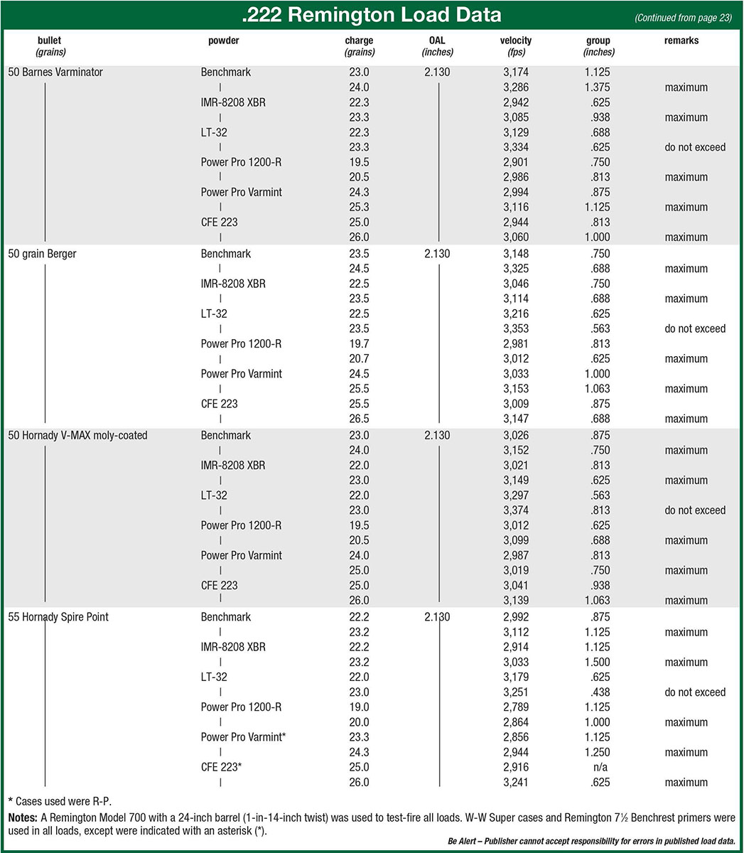 Prior to the release of Power Pro 1200-R, Alliant released another of its Power Pro line intended for a broader range of varmint cartridges, Power Pro Varmint. The powder works well in the 222 Remington but does not produce quite the velocity of the other powders and is perhaps best suited for cartridges with a larger case capacity.