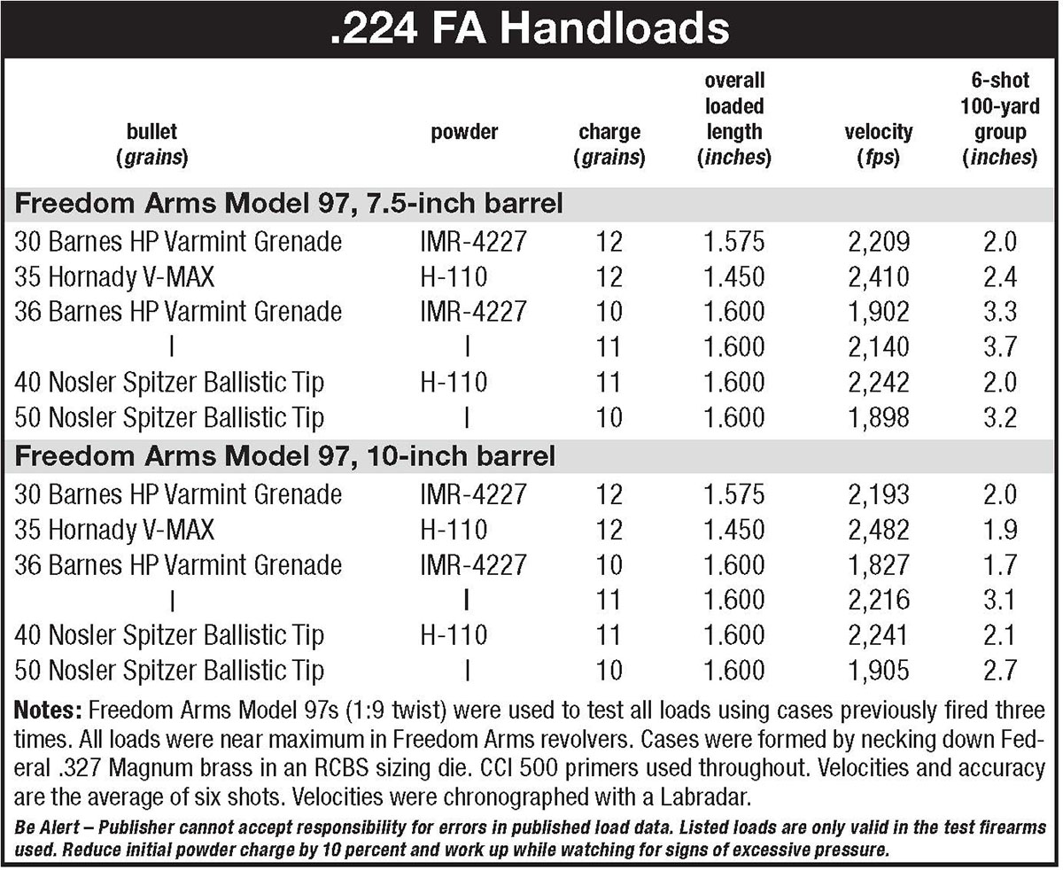 The most distinctive feature of the new 224 FA caliber is that it’s a bottleneck cartridge, specifically a .327 Magnum case necked down to fire .22-caliber rifle bullets. Maximum overall cartridge length is 1.60 inches to ensure the loaded round does not protrude from the front of the cylinder. There are a couple of excellent reasons for using the Federal .327 Magnum case. The smaller case diameter allows the Model 97 to be a traditional “six shooter” and because of its transfer bar system, it can be carried with all chambers loaded. In fact, all of Freedom Arms’ Model 97s under .40 caliber are six shooters; those chambered in .41 Mag, .44 Special and .45 Colt hold five rounds. In addition, the .327 Magnum case is designed to operate at pressures above 40,000 pounds per square inch (psi), higher than any of the other handgun magnum calibers except the .454 Casull. Loaded with .22-caliber rifle bullets weighing from 30 to 50 grains that are launched at around 2,000 feet per second (fps), the little revolver definitely qualifies as a long-range varmint option.