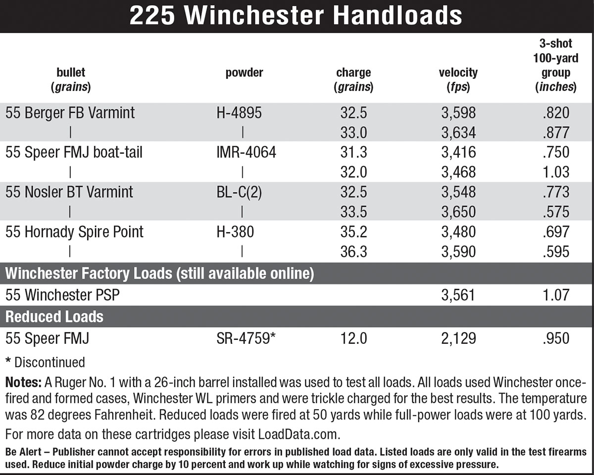 In the end, and while I may have gone overboard on the weight of the octagonal barrel, if you just take the 225 Winchester at its own merits, study the charts and research, you can find or have a rifle made and get down to serious handloading without exceeding the maximums, this is a great cartridge to work with. I found that a combination of using an old world-type of rifle like the Ruger No. 1 just added a bit of nostalgia to the project bringing it to the point of wonderment on just why isn’t the 225 Winchester cartridge being offered today in a production or specialized rifle; possibly in a limited run version.