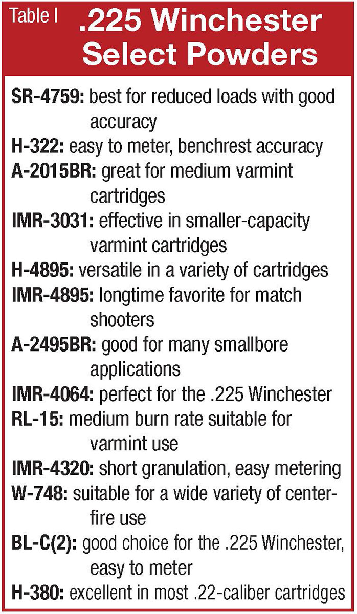 The choice of powders is extremely broad today. Sitting by the wood stove last winter, I researched propellants for the 225 Winchester that would be cost-effective in terms of yielding the best results in accuracy and velocity. In the end, I came up with a baker’s dozen (with a few reduced loads) that, with a few exceptions, should be useful to a handloader (see Table I).