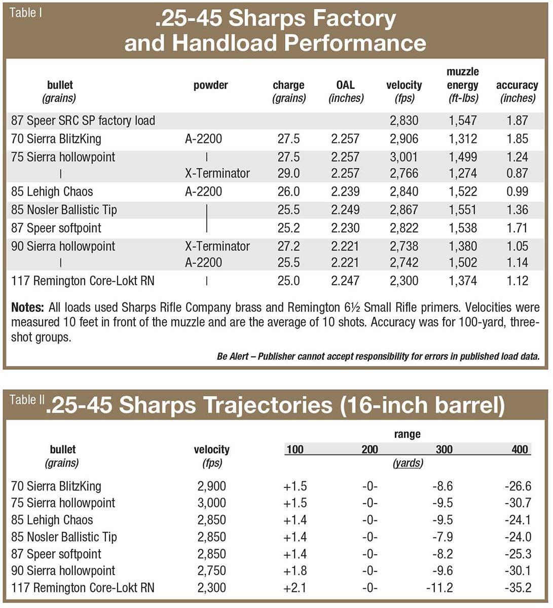 Recoil with all loads was hardly distinguishable from the 223 Remington, and with handloads accuracy was very good in the AR, so I decided to take another step. On hand was a Mossberg MVP I’d wanted to convert to a utility-type rifle suitable for varmints, deer and home defense. An 18-inch Shilen barrel with a one-in-10-inch twist was installed and chambered for 25-45 Sharps. All handloads were tested in it as well. Velocities ran about 50 fps faster, and accuracy was improved, on average, by about 12 percent.