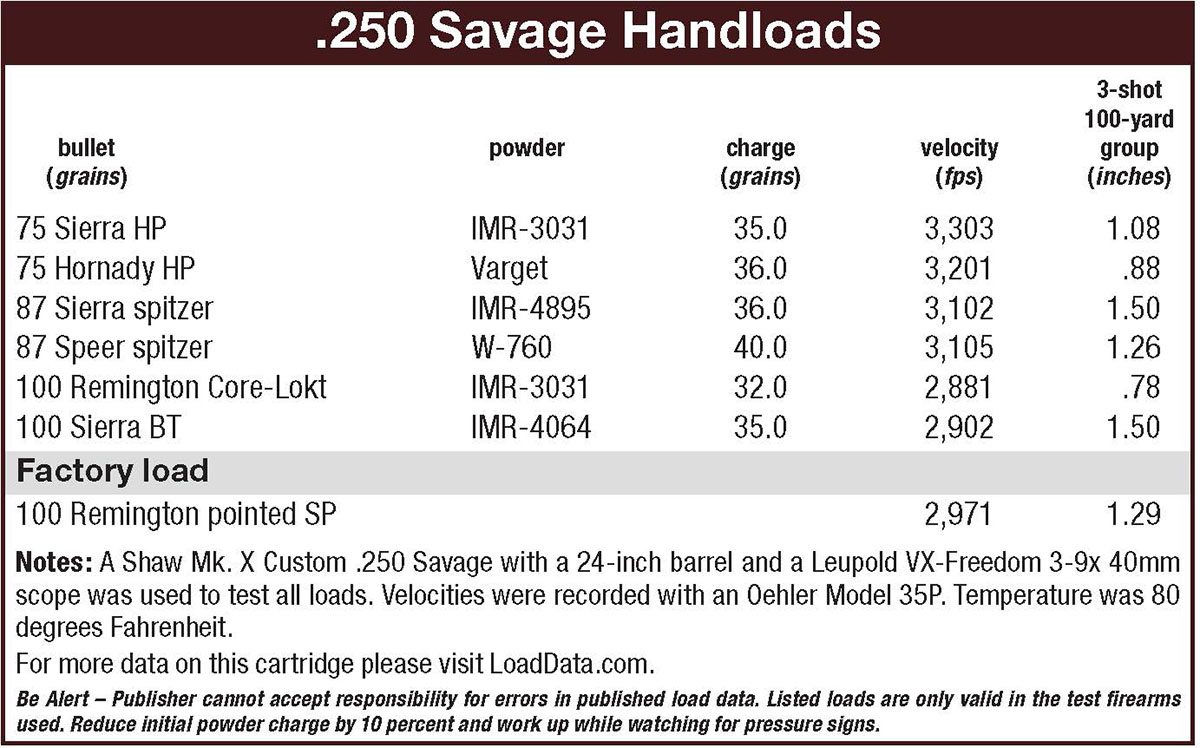 When it came to this project, I had the 250 Savage in mind. Classic cartridges have always been a favorite of mine, and the 250-3000 Savage with its unique history is still interesting. While 3,000 fps does not seem like a big thing today, back in 1915 when introduced, it was a milestone in ballistics. Granted, it was realized with only an 87-grain bullet, but it still was an accomplishment, especially when used as a varmint or medium-game round. While the 257 Roberts gave the Savage some competition, it was the popular 6mm cartridges that overshadowed it in the mid-1950s. Reloading the 250 Savage is easy, and although a handloader might find it challenging to locate new brass or even factory ammunition, bullet and powder selection make it an easy cartridge to load and shoot.