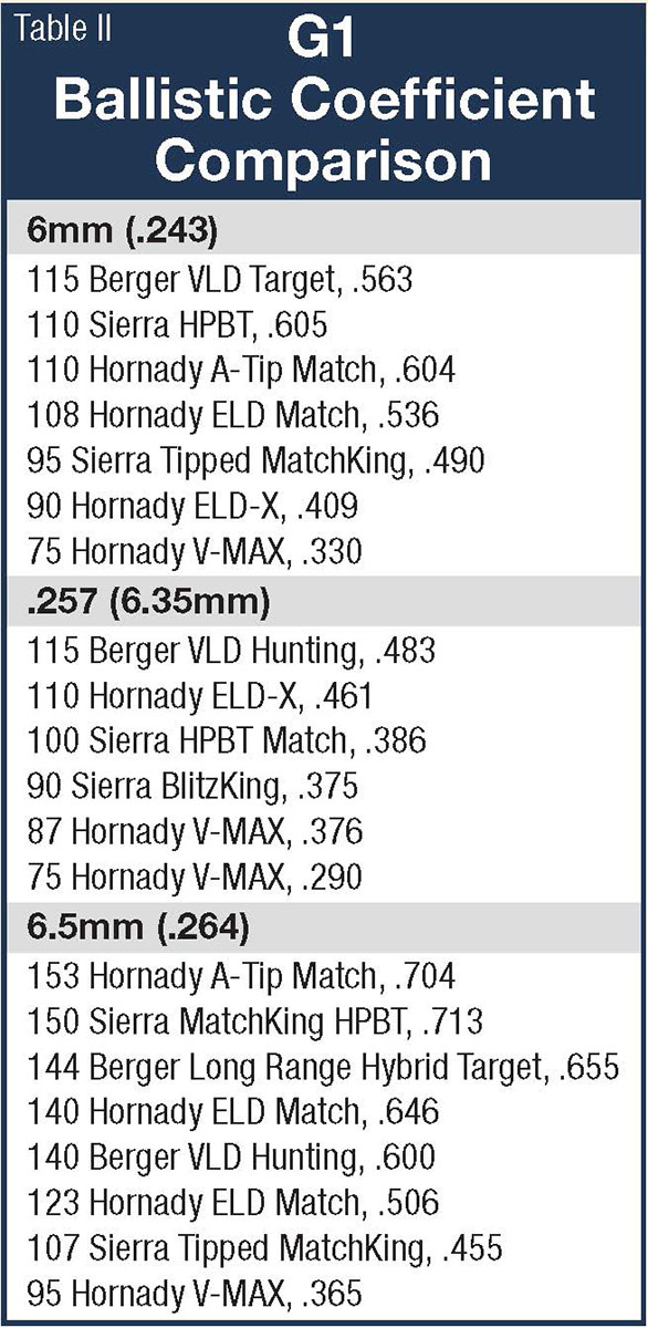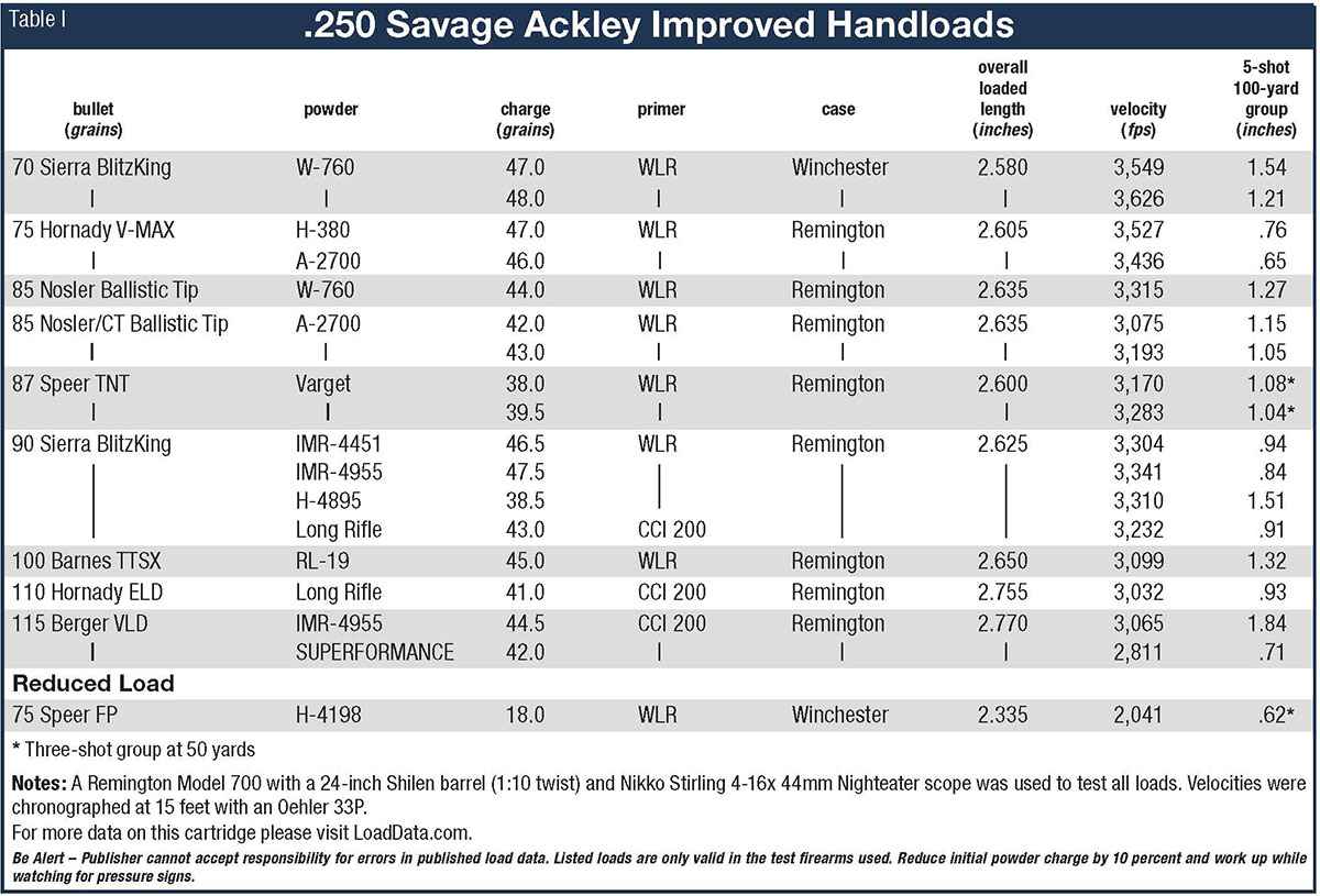 For varmint hunters, there is a wide range of .25-caliber bullets that will cover most needs. The loading table with this story has everything from close to midrange, explosive performance loads with bullets like the Sierra 70-grain BlitzKing and Hornady 75-grain V-MAX, up to the long-range abilities of the Hornady 110-grain ELD and the 115-grain Berger VLD Hunting that will make 500- and 600-yard shots very doable.