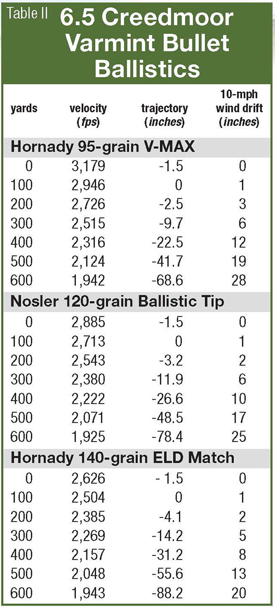 More than any other shooters, people who shoot the 6.5 Creedmoor are infatuated with ballistics. So let’s get down to the dope on trajectories of different bullet weights and shapes. One of the better loads my Sauer Model 100 shot was Hornady 95-grain V-MAX bullets fired at 3,179 fps paired with 42.5 grains of Varget. At that velocity, V-MAX bullets have the drop and wind drifts listed in Table II.