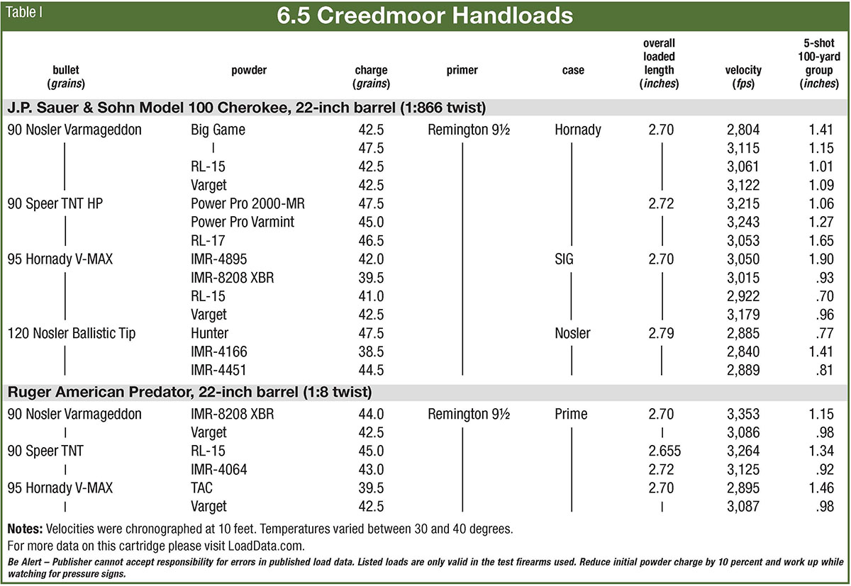 A Sauer Model 100 Cherokee rifle chambered in 6.5 Creedmoor was used to shoot some of the loads listed in the load table.