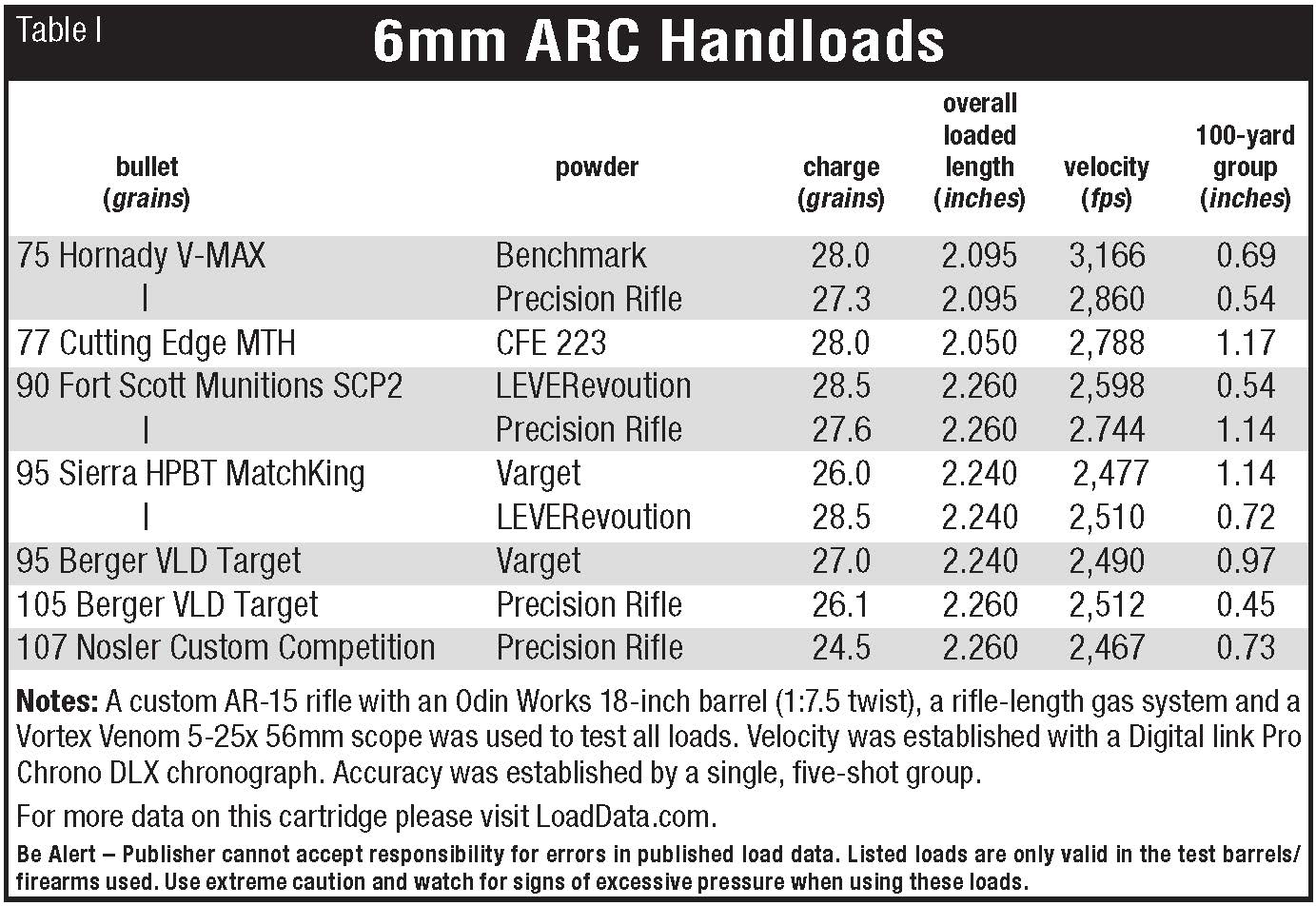 All right, let’s get into the good stuff. With Hornady and Starline offering brass, the handloader now has options. People have taken 6.5 Grendel brass and necked it down to 6mm, then fire-formed the brass. This process takes time and is not necessary since I had a lot of once-fired factory brass from shooting Hornady ammunition. There are numerous good sources for load data; my primary sources were Hornady and LoadData.com. There were a few instances of copper bullets for which no data was available, so I used QuickLOAD to obtain the necessary data. A huge plus to the handloader is the vast number of bullets available for the 6mm ARC.