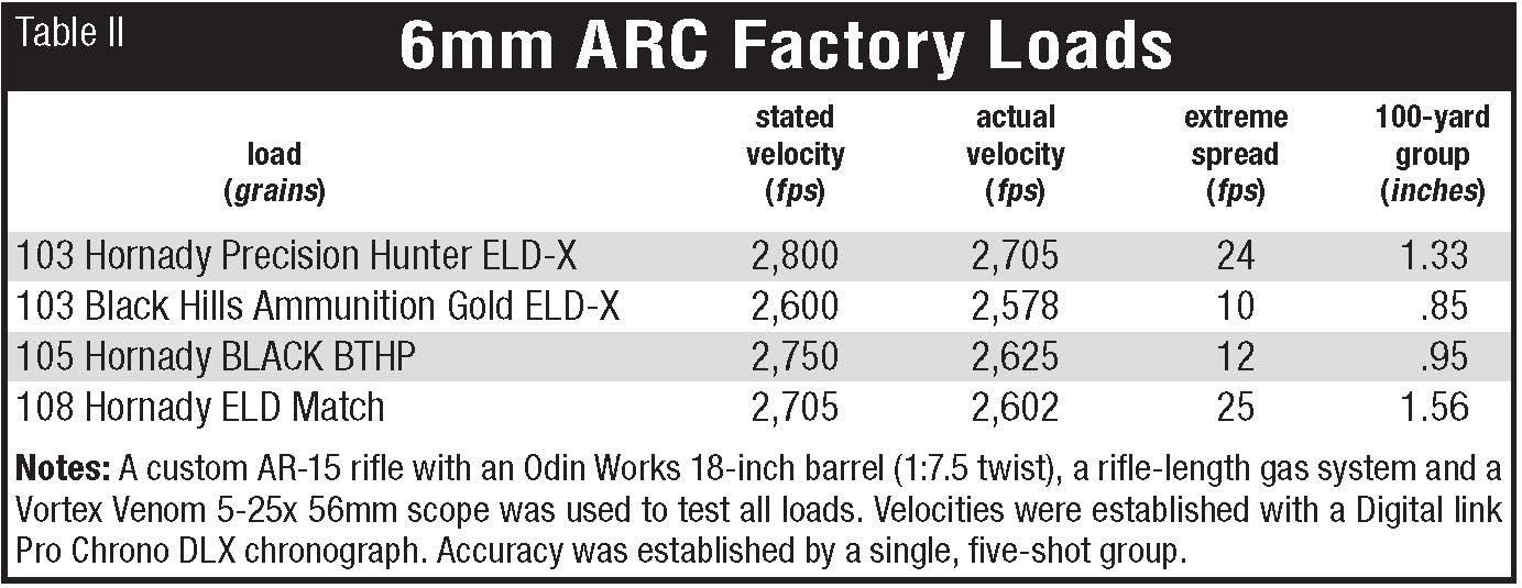 Putting those two rifle cartridges aside, I was excited when I heard about the 6mm Advanced Rifle Cartridge (ARC). Hornady designed this cartridge for a specialized entity within the Department of Defense. The goal was to replace the 5.56 NATO and 7.62 NATO rounds and have the capability to engage targets at ranges of 300 to 600 meters. The cartridge would need to have low recoil and be capable of a high degree of accuracy without switching from the AR-15 rifles already in service. The new 6mm ARC case is based on the 6.5 Grendel. The main difference is that the shoulder and neck geometry was designed to accommodate the long and sleek 6mm (.243) bullets, which are known for their high ballistic coefficients and high sectional density. They offer less drag and better energy retention at extended ranges. The one limiting factor is the maximum pressure of 52,000 pounds per square inch (psi) in the AR platform, as per SAAMI (Sporting Arms and Ammunition Manufacturers’ Institute) specifications. A bolt gun can be run at a higher pressure (62,000 psi) mainly because the bolt heads are generally more robust than those in the AR-15.