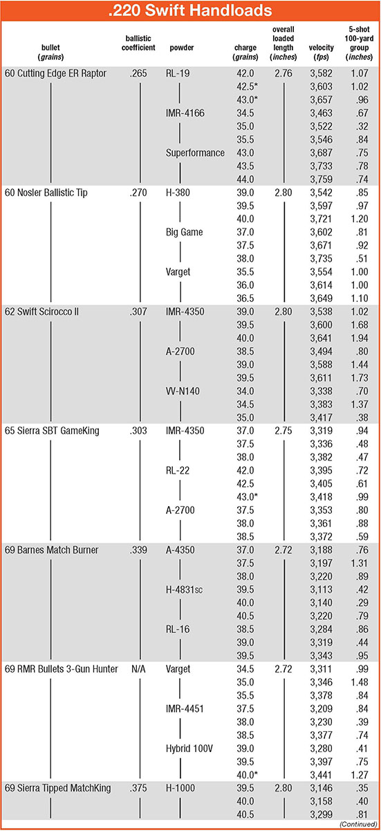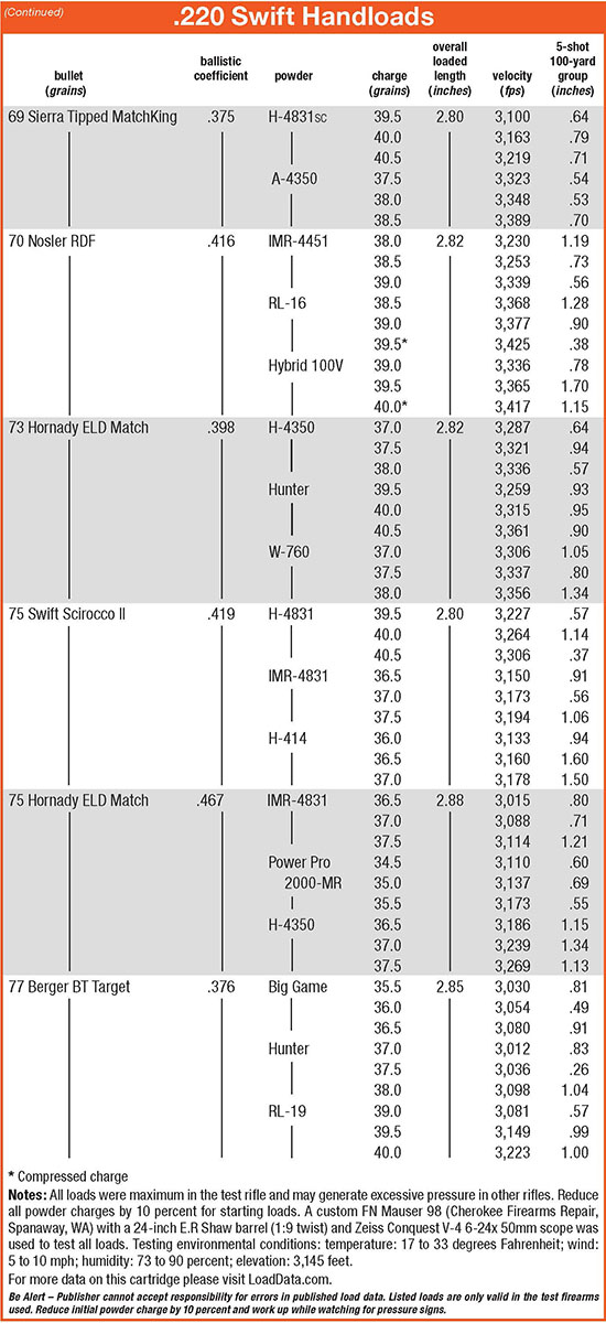 Load development posed initial challenges, as most 220 Swift load data dead-ends with 60-grain bullets in step with standard-issue rifling twists. Berger Bullets and Sierra loading manuals provided welcomed heavy-bullet starting points. The question then became how far bullet weight/length could be pushed in relation to the 1:9 twist. So I started where most others stop; 60 grains, working toward 75- to 80-grain bullets with BCs of .467 and .485, respectively. The goal was to create accurate 400-plus-yard loads for wind-cursed Western hunts for ground squirrels, prairie dogs, rockchucks and coyotes.