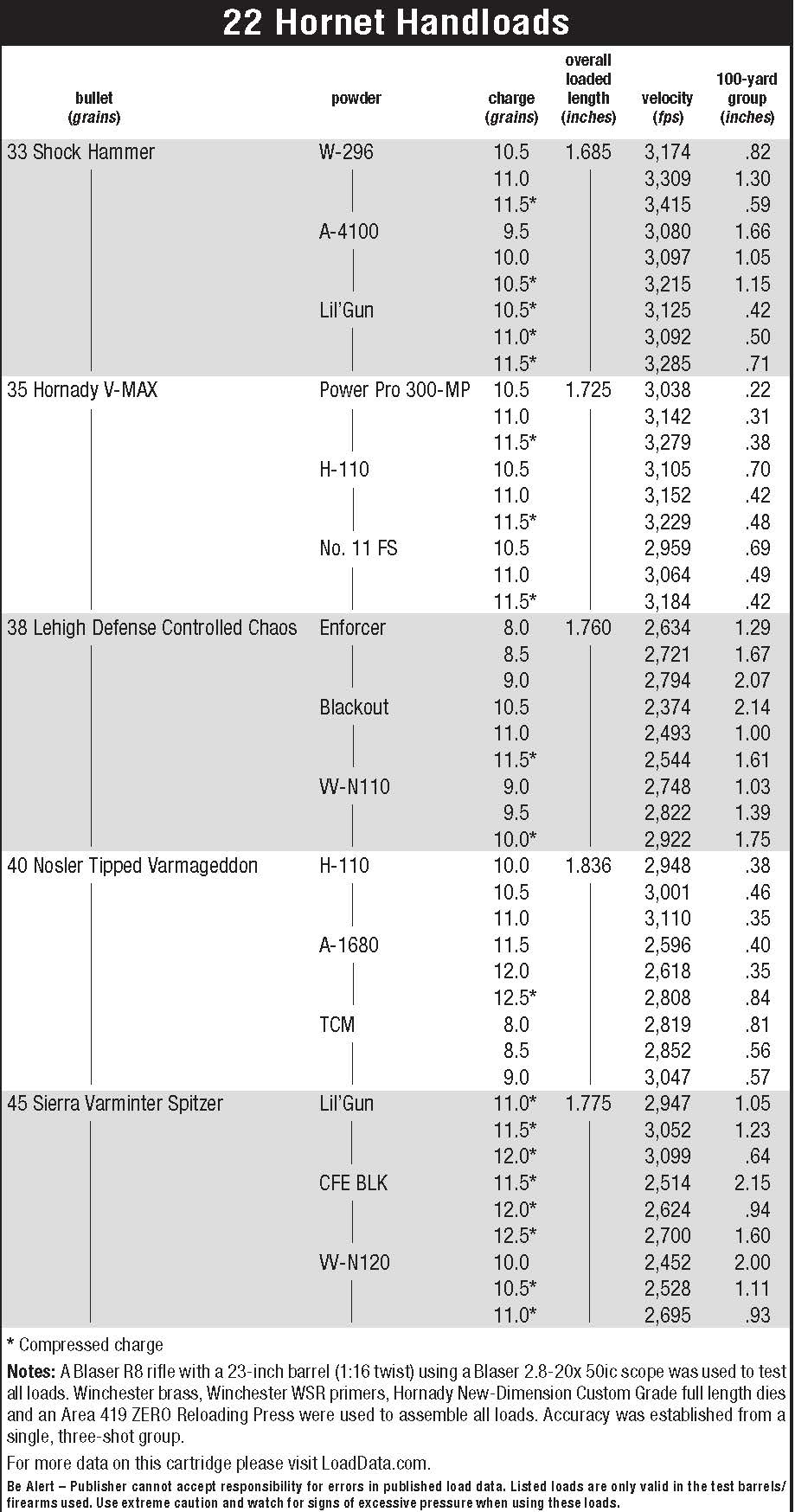 I’m one of those romantics who has kept the 22 Hornet alive. I own two bolt-action 22 Hornet rifles (Savage Model 340E and 25) and a couple of handguns (T/C Contender and Taurus revolver) that see regular action each spring. This has inspired untold hours of load development, as factory Hornet ammunition is prohibitively expensive, difficult to find and seldom loaded with the bullets I prefer. This load development has involved auditioning newer Hornet powder options and maximizing performance through modern bullet designs.