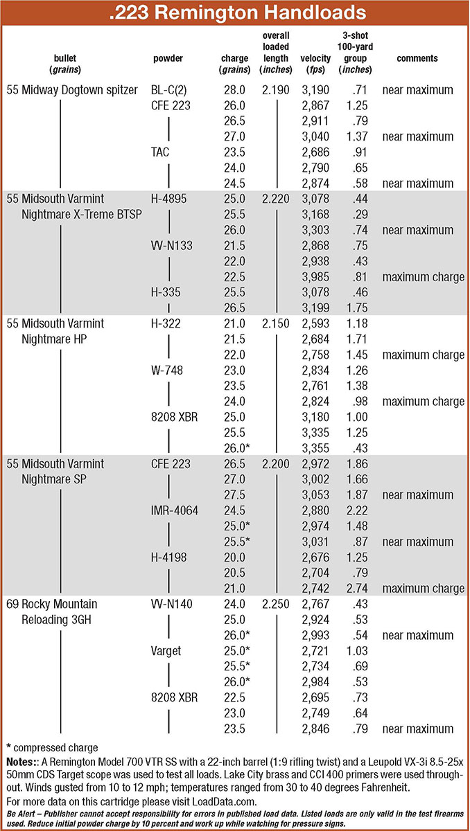I have several hundred prepped and primed, once-fired Lake City brass on tap (sorted freebie pickups), cases that have traditionally proven to be reliable. They hold 30 grains of water on average; comparable with Hornady, Remington, Federal and Winchester brass. Bullets consisted of four Midway Dogtown selections in 50- and 55-grain hollowpoints and softpoints, five Midsouth Shooters Supply Varmint Nightmare X-Treme and Varmint Nightmare offerings, including 34-grain hollowpoints, 50- and 55-grain HPs and softpoints, plus Rocky Mountain Reloading’s new 69-grain BTHP 3-Gun Hunter. The latter successfully mimics Sierra MatchKing ballistic characteristics, but with an explosive tip and internal crimp that checks expansion. A sufficient supply of CCI 400 primers was on hand.
