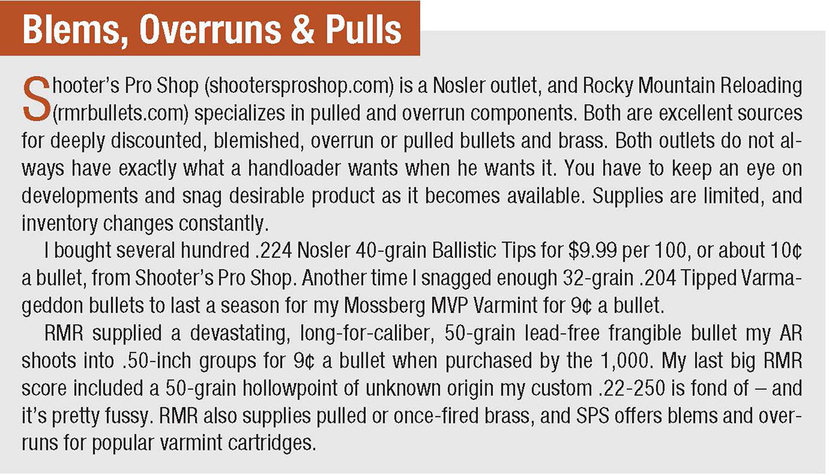 Still more savings is found through private-label bullets from outlets such as Midway USA, Midsouth Shooters Supply and Rocky Mountain Reloading (RMR) – in addition to blemished, overrun or pulled bullets offered at deep discounts by certain outfits (see sidebar). These bullets cost 13¢ to 15¢ apiece purchased in 100 packs, pennies per bullet less when 1,000-count orders are made from outlets such as RMR. This is in contrast to name-brand or boutique bullets running from 25¢ to $1 each.