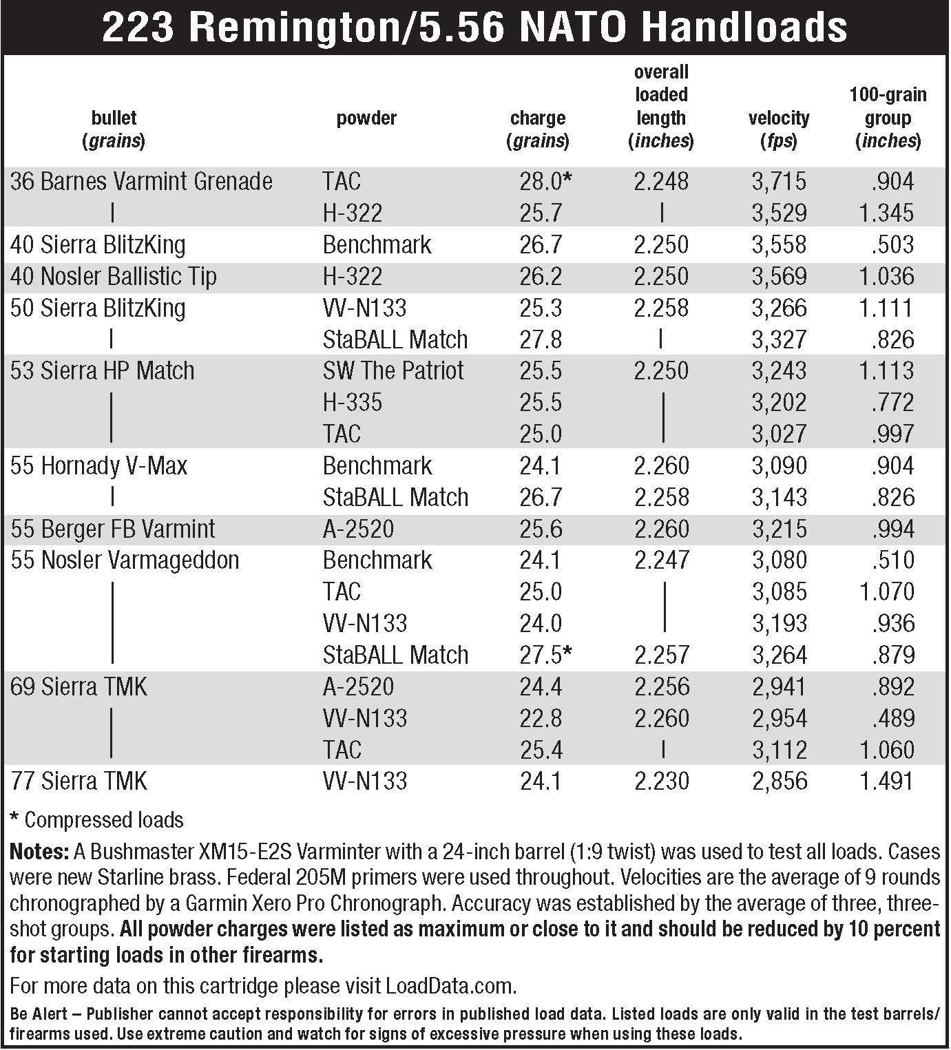 I took the same approach to the propellants. There is no shortage of good powders for the 223/5.56, and I picked some of my favorites. In addition, I was able to test Vihtavuori N133, a powder I had never used before, and a new propellant from Shooters World called The Patriot.