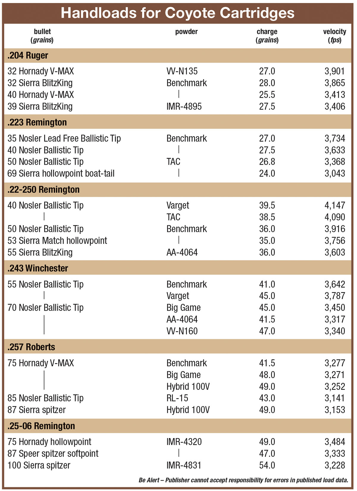The .223 Remington along with the .204 Ruger, .22-250 Remington, .243 Winchester and .25-06 Remington fairly well encompass popular coyote cartridges. These cartridges put their bullets on the mark at 200 yards when sighted in .25 inch either side of an inch high at 100 yards. The bullets drop between 5 and 6 inches at 300 yards, so with the crosshairs on top of the back of a coyote at that distance, they will roll it over. After another 100 yards, though, bullets from these cartridges truly start falling, with three times as much drop as they had at 300 yards. At 500 yards the drop is double that at 400 yards.
