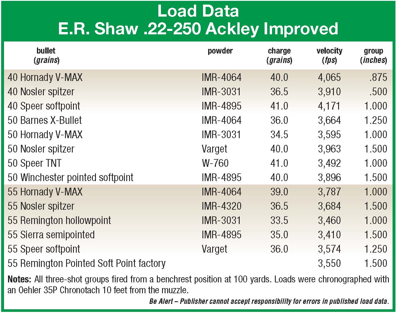 Priming was done with Remington 9 1⁄2 Large Rifle primers, and medium-burning powders were used in the 22-250 Improved. Research consisted of loads in the Nosler Reloading Guide 6 with additional data from P.O. Ackley’s book Handbook for Shooters and Reloaders, Volume I and Wolfe Publishing’s book Wildcat Cartridges. While the Improved version can use bullets up to 70 grains, my preference is for lighter-weight bullets from 40 to 55 grains.