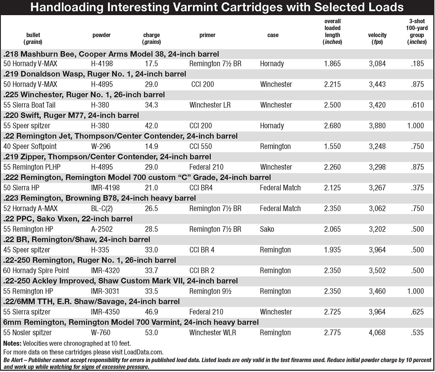 No varmint shooter would leave out the fabled 225 Winchester, which came on board as a major player in varmint cartridges. My Ruger No. 1 was one flat shooting, very accurate version of the 225, complete with a 26-inch octagonal barrel. With a Sierra 55-grain boat tail and 34.3 grains of H-380 in the case, groups came in at .610 inch or less with a velocity averaging 3,420 feet per second (fps).