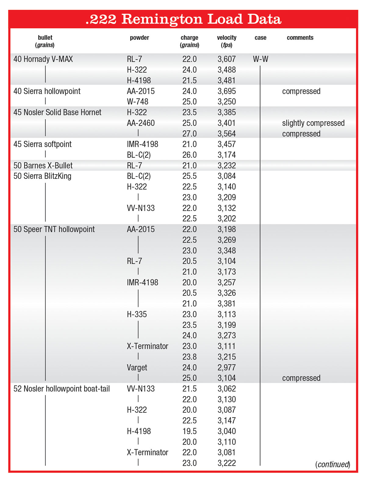 It is relatively easy to assemble accurate handloads for the .222 Remington. If developing loads for the first time, however, there are a few items to be aware of. For example, brass produced by Remington UMC for the first 15 to 20 years (give or take a few years) was thinner than the Remington R-P cases produced today, therefore it had greater powder capacity. The point being, older data developed for the early cases, but used with today’s brass, will probably give greater pressures and, in some instances, may be a compressed charge. In the accompanying table, brass from both Winchester and Remington were used. For reference, Winchester cases weighed 94.1 grains (with primer installed) and had a water capacity of 24.6 grains. Remington (R-P) cases weighed 92.6 grains and held 25.0 grains of water. The neck is long enough that when bullets are seated to an overall cartridge length of 2.130 inches, the bases of most 50- and 55-grain bullets don’t extend to the base of the neck, so actual capacity is slightly greater than water capacities indicate.