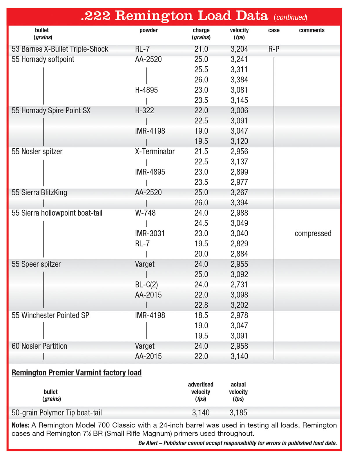 Both small rifle and small rifle magnum primers can produce fine results, although some powders are better ignited with the magnum version. Some exper-imenting was conducted with Hodgdon BL-C(2), H-322, Winchester 748 and IMR-4198 powders. Using a Remington 71⁄2 Bench Rest primer (small rifle magnum), in each instance higher velocities were achieved when compared with the same powder charge that was ignited with a Remington 61⁄2 primer (small rifle non-magnum). Neither combination produced excessive pressures. Overall, however, magnum primers seem to give more consistent velocities and are what the factories use for their .222 ammunition. For these reasons all loads in the accompanying table were developed using Remington’s 71⁄2 Bench Rest primer.