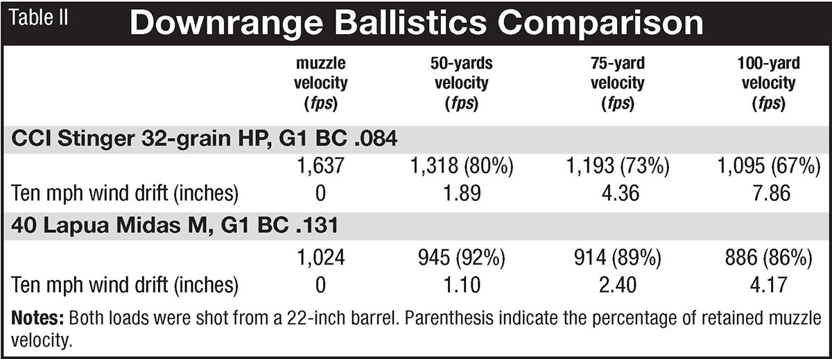 An example of what Rinker wrote is the accompanying Table II comparing CCI Stinger 32-grain bullets with a muzzle velocity of 1,637 fps to Lapua Midas M 40-grain bullets fired at 1,024 fps, both from the 22-inch barrel of the Cooper Model 57M. The numbers in parentheses show the percentage of retained muzzle velocity at the different distances.