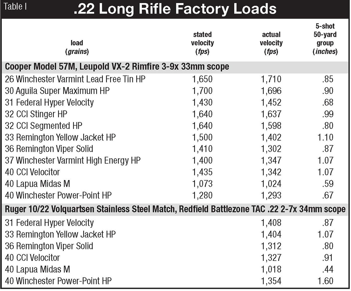 Over the decades, 22 LR rifles have been made in hundreds of models by dozens of manufacturers. The resulting numerous types of chamber lead angles and rifling in those 22 rifles make it impossible that one 22 load shoots accurately in all rifles. For instance, Winchester Power-Points averaged .67 inch for two, five-shot groups shot from the Cooper Model 57M, but averaged 1.60 inches shot from the Volquartsen match barrel on the Ruger 10/22. The Volquartsen barrel, though, more than held its own when shooting other loads.