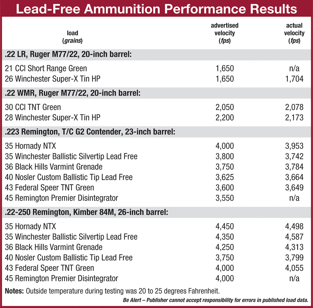 Winchester’s .22 WMR lead-free load features a 28-grain Super-X copper-jacketed, tin-core hollowpoint bullet at 2,200 fps. This load was cross-referenced in two rifles, a Marlin Model 925M and a Ruger Model 77/22, with 75-yard, five-shot groups measuring .78 and 1.22 inches, respectively. These group sizes were more or less repeatable and should be considered a good load by any standard. Unfortunately, other than a very unlucky Idaho ground squirrel that poked its head out in February, opportunities to check this load in the field for terminal performance have been limited.