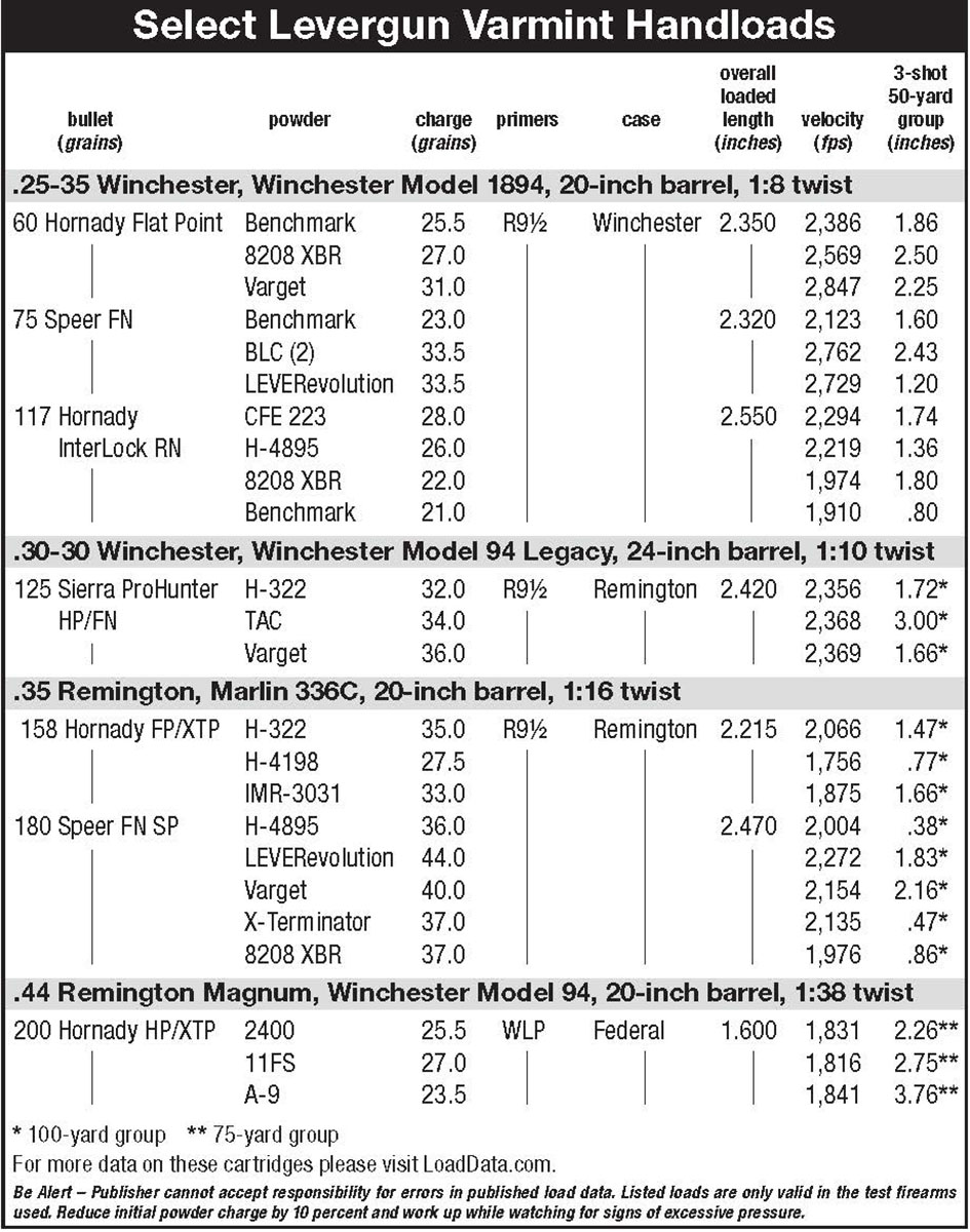 Some homework may be required to develop a suitable small-game load with a lighter-weight bullet for lever-action rifles. Keep in mind, a light bullet fired at a relatively higher velocity most likely hits higher than standard-weight bullets. A rifle with a rear aperture sight with plenty of vertical adjustment, or a scope, can easily be adjusted to compensate for that difference. Many older lever-action guns came with a rear sight that provided multiple sighting options, such as the Winchester three-leaf “express” or the Lyman Model 21 rear aperture sight on one of my Winchester Model 94 carbines. However, ordinary open sights may not have enough adjustment. Installing a taller front sight does lower bullet impact. But it is simpler to juggle bullet weight and also powder charge weight that can alter trajectory to mesh with open sights.