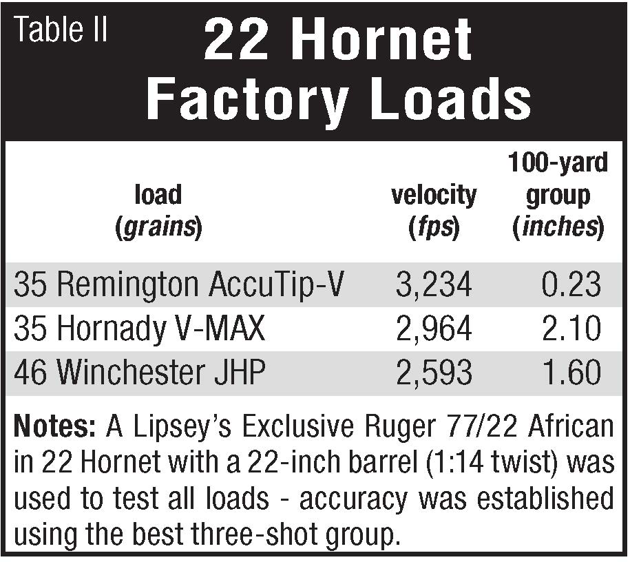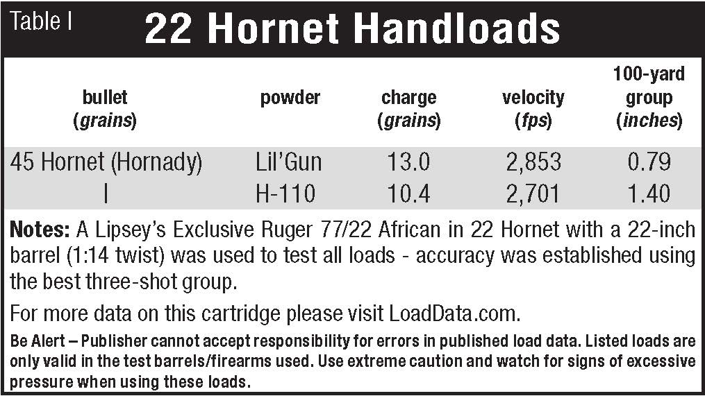 Are there “better” varmint cartridges available these days? Well, there certainly are cartridges that fire a projectile faster and farther than the capabilities of the old 22 Hornet, no argument there. However, this efficient little cartridge housed in a sleek stalking rifle like the Ruger 77/22 African is an absolute hunter’s small-game rifle. The duo makes a perfect combination for the outdoorsmen who take delight in testing their predatory skills by slipping up on wary prey as close as possible before losing a carefully aimed shot into whatever game animal or varmint is the target of the day. The 22 Hornet is made for true, dyed-in-the-wool sportsmen who relish close encounters with handy rifles. There are faster choices for the long-range shooter, but there may not be a better choice for the crafty woodsman who wants a classy bolt gun in a classic cartridge!