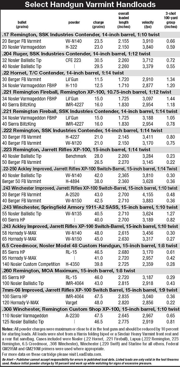 For all-around use in varmint fields, the 223 Remington is the best choice, same as it is for rifles. I have shot it alongside the 22-250 Improved, and while the bigger cartridge is a bit better on windy days and it does reach out a bit farther, the difference between it and the 223 is not enough to justify shorter barrel accuracy life and additional muzzle blast. I love the 17 Remington and 204 Ruger, but at the end of the day I don’t shoot them any better than the 223.