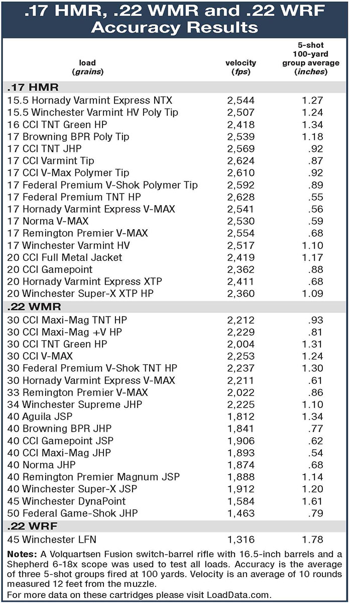 Tom Volquartsen was first to offer an autoloading rifle in 17 HMR and 22 WMR that worked satisfactorily, and his secret was no secret at all. Whereas other companies modified existing rifles designed for the 22 Long Rifle cartridge, Volquartsen designed a rifle specifically for the two magnum cartridges. I have a couple of his standard rifles in 17 HMR and 22 WMR, and while both are tack drivers, the Fusion is the one I have used most because its quick-switch barrels allow me to compare the performance of both cartridges on varmint shoots without taking along two rifles. Barrels are fast and easy to change; unscrew the AR-15-style aluminum barrel shroud from the receiver, remove the barrel by pulling it forward, install the other barrel, reattach the barrel shroud and keep on shooting. Possibly due to tighter bores, both barrels often deliver higher velocities than longer barrels. As an example, velocity of the Hornady 30-grain V-MAX from the 20-inch barrel of my Ruger 77/22M 22 WMR is 2,161 fps versus 2,211 fps from the 16.5-inch Volquartsen barrel.