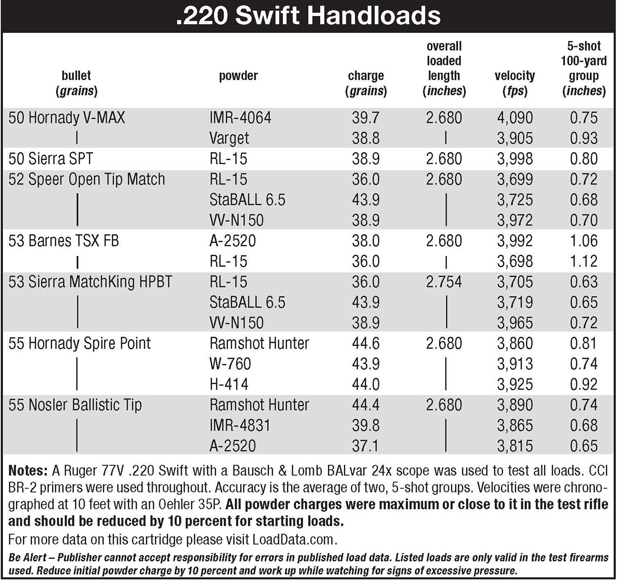 At the end of the day, this Ruger 220 Swift favored the load of 36 grains of Alliant Reloder 15 behind the Sierra .224-diameter, 52-grain hollowpoint boat-tail MatchKing bullet ignited by the CCI BR-2 primer over all other loads tried.